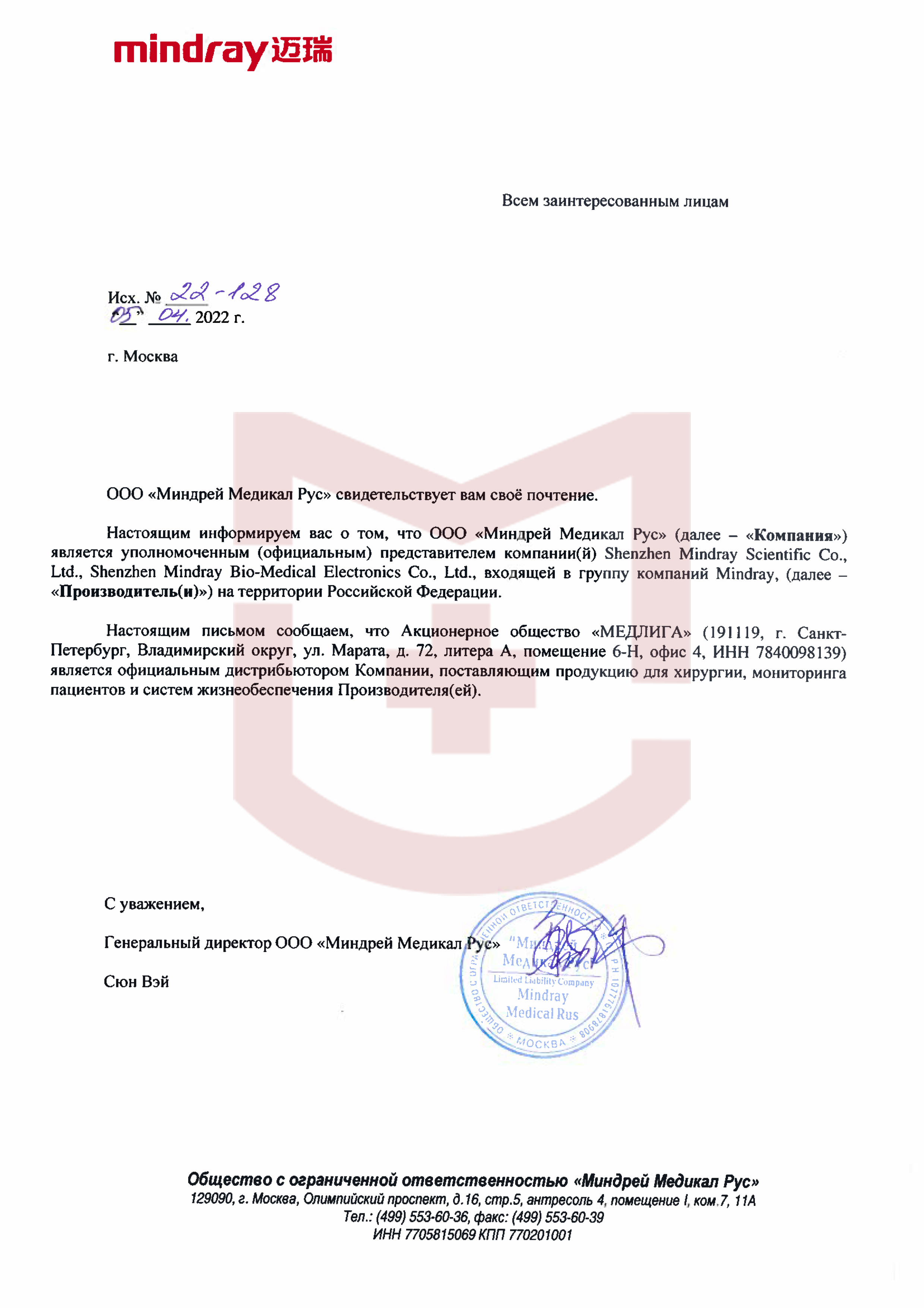 Авторизационное письмо Mindray (АиР)