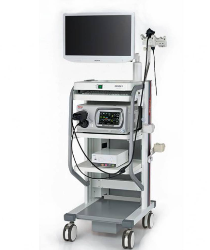 Видеоэндоскопы подключаются к эндоскопической стойке, которая состоит из видеопроцессора, где происходит обработка видео, дисплея, на который выводится получаемой изображение. А также, в состав эндоскопической системы визуализации обычно входит приборная тележка с держателями монитора и эндоскопа, аспиратор, ирригационная помпа, инсуффлятор (для колоноскопии).