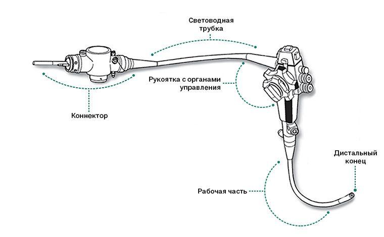 Для обработки получаемых изображений видеоэндоскоп подсоединяется к эндоскопическому видеопроцессору. Во время эндоскопии гибкая трубка рабочей части вводится в полости тела. В дистальном конце эндоскопа расположены элементы, позволяющие производить манипуляции: биопсийный канал, канал для подачи воды и воздуха, а также линза световода.