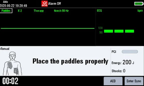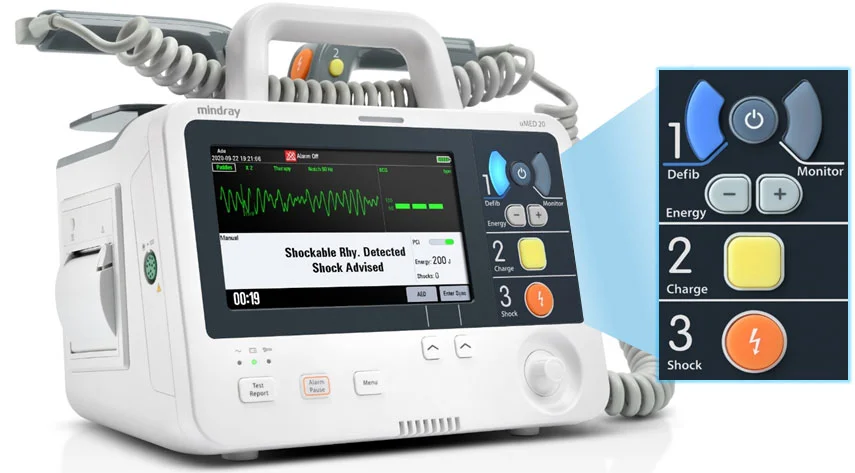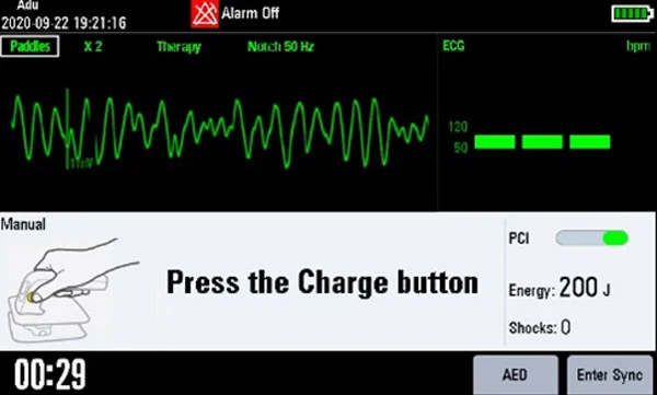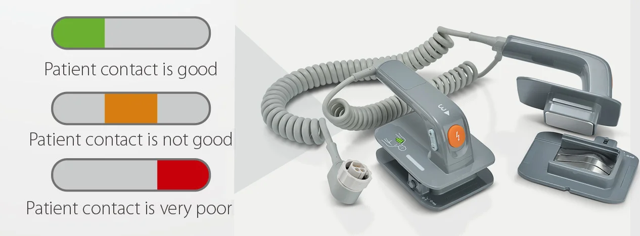 Кнопки для выбора мощности, зарядки и подачи разряда повышают удобство использования для врачей. Индикаторы контакта с пациентом как на рукоятках, так и на экране позволяют визуально контролировать контакт с пациентом для обеспечения эффективности заряда.