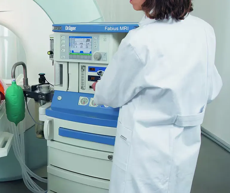 Dräger Fabius MRI — наркозно-дыхательный аппарат, применяемый для вентиляции лёгких при использовании МРТ-аппарата. Устройство подходит для пациентов всех возрастов (младенцы, дети и взрослые). Дизайн устройства позволяет улучшать модель при помощи дополнительных аксессуаров, а также разместить её в удобном месте. Расширьте диагностические возможности вашего устройства МРТ с помощью современной вентиляции в аппарате Dräger Fabius MRI, разработанном специально для работы в условиях МРТ.