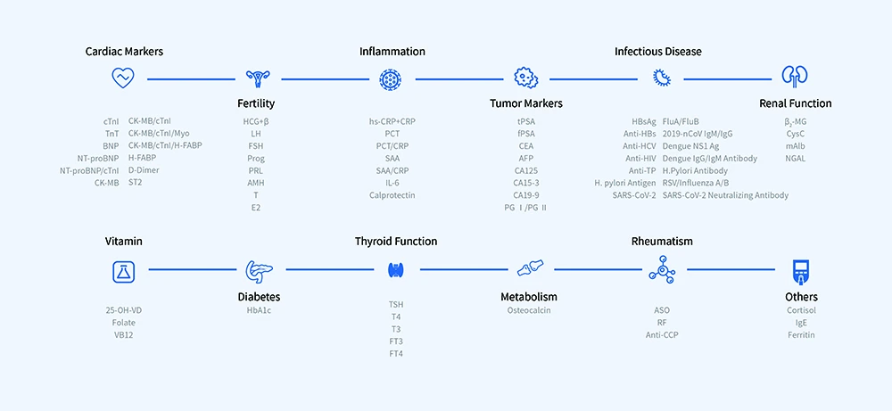 Медицинское изделие используется для экстренной клинической диагностики пациента при исследовании назофарингеальных секретов, сыворотки, плазмы, цельной крови, мочи и кала человека. Диапазоны измерения: cTnI: 0.1 – 50.0 нг/мл, PCT: 0.1 – 50.0 нг/мл, D-dimer: 0.1 – 10.0 мг/мл, CRP / hs-CRP: 0.5 – 200.0 мг/мл, NT-proBNP: 100.0 – 35000.0 пг/мл, СК-МВ: 2.5 – 80.0 нг/мл, Myo: 30.0 – 600.0 нг/мл, β-hCG: 5.0 – 100000.0 мМЕ/мл, mAlb: 10.0 – 200.0 мг/л, HbA1c: 2.0 – 14.0%, TSH: 0.1 – 50.0 мкМЕ/мл, FOB: 25.0 – 1000.0 нг/мл, tPSA: 0.4 – 100.0 нг/мл, fT4: 1.0 – 100.0 пмоль/л, 25-OH-VD: 8.00 – 70.00 нг/мл, SARS-CoV-2 Ag: 0.5 – 1000.0 бод/мл.