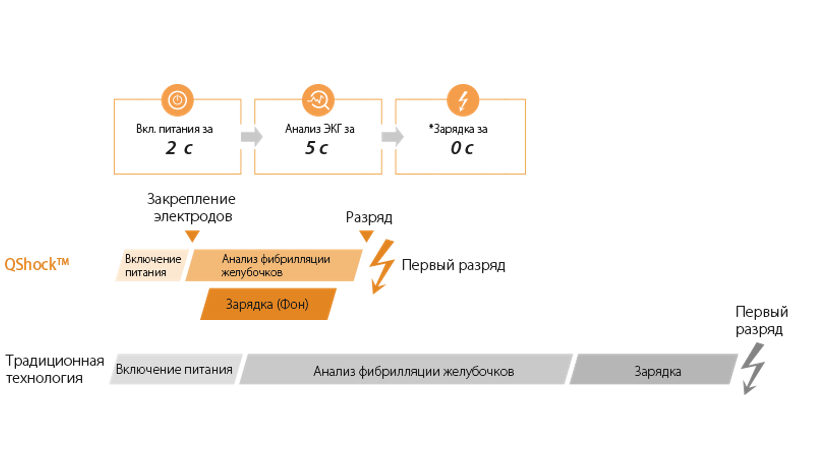 вероятность успешной дефибрилляции существенно повышается. Для выполнения первого разряда требуется менее 8 секунд.