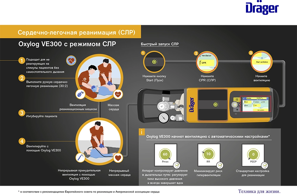 Oxylog VE300 поддерживает и облегчает проведение сердечно-лёгочной реанимации, освобождая руки медицинского работника. Переход в режим сердечно-лёгочной реанимации осуществляется одним нажатием кнопки и запускается мгновенно. Аппарат сам скорректирует предварительные настройки, а специалист сможет полностью сосредоточиться на пациенте.