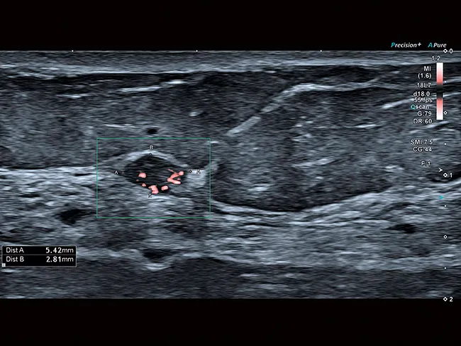 Уровень визуализации сосудов SMI в сочетании с высокой частотой кадров повышает достоверность диагностики при оценке поражений, кист и опухолей.
